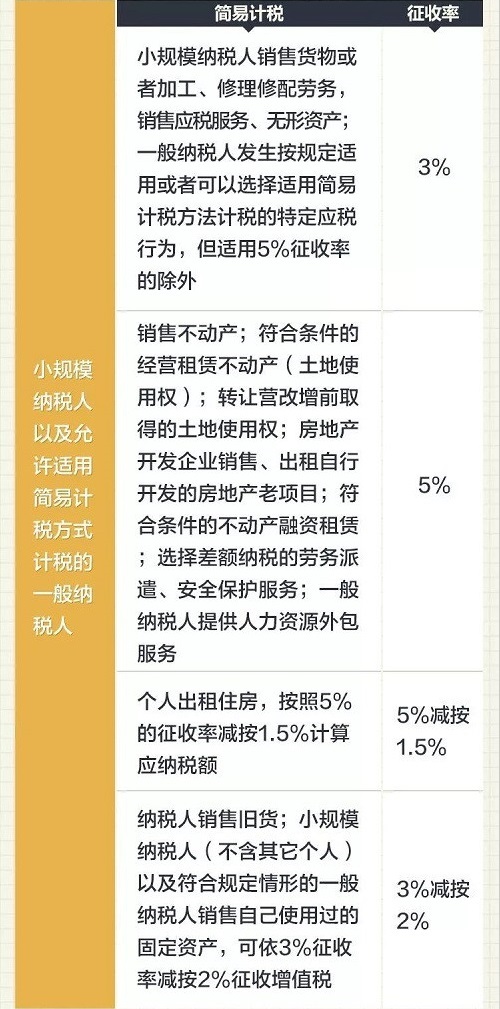 增值税征收率统一为3%(财政部和国家税务总局另有规定的除外)建筑业老项目简易征收率为3%;小规模纳税人增值税征收率为3%;