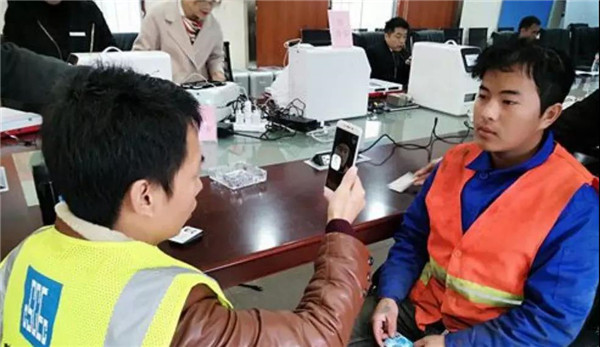 建筑工地用公安部认证的二代身份证识别设备采集人员信息,用手机拍照上传平台,完成农民工实名信息登记,通过地毯式检查督促建筑工地为农民工办理实名登记。