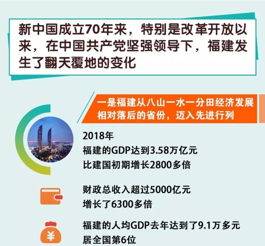 在7月19日国新办举行的省(区、市)系列新闻发布会上,中共福建省委书记、福建省人大常委会主任于伟国介绍,2018年,福建的GDP达到3.58万亿元,比建国初期增长2800多倍,财政总收入超过5000亿元,增长了6300多倍。福建的人均GDP去年达到9.1万多元,居全国第6位。